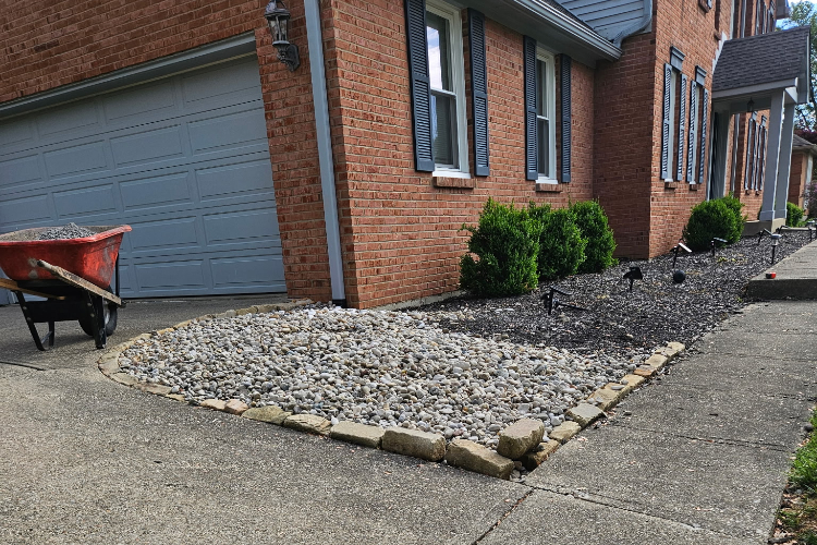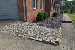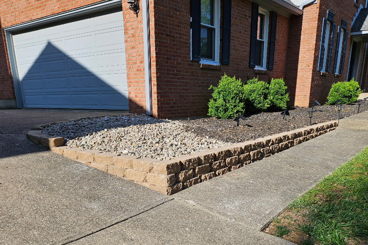 Residential retaining wall. Not all problems require big solutions. One of our customers in Union, Kentucky was having problems with rock washing out of their landscaping bed when it rained. Our solution was a small retaining wall.